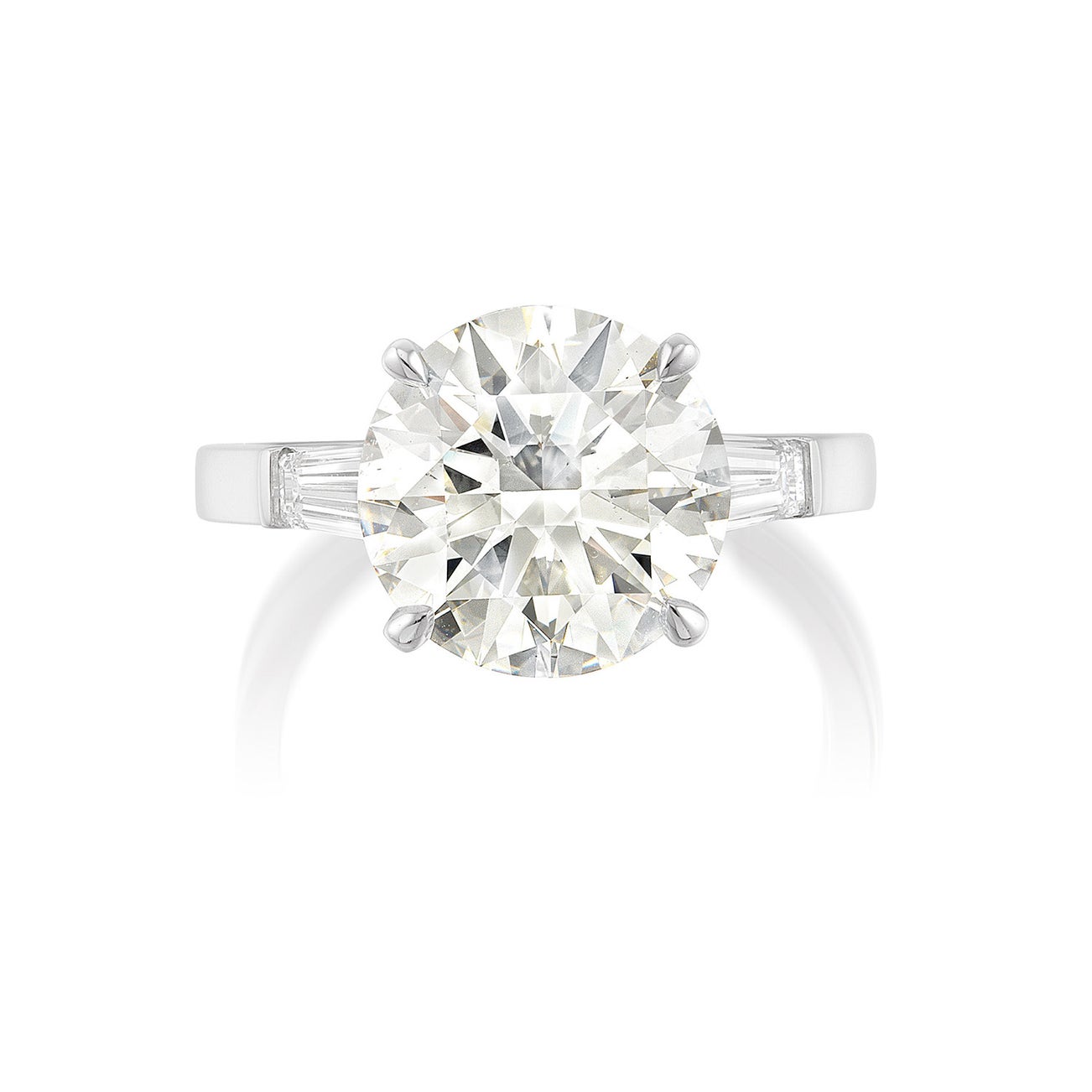 One brilliant-cut diamond, 5.23 caratsTwo tapered baguette-cut diamonds on the sidesPlatinumSigned Hermitage<em>GIA Report: J colour, SI2 clarity, Excellent Cut, Polish and Symmetry