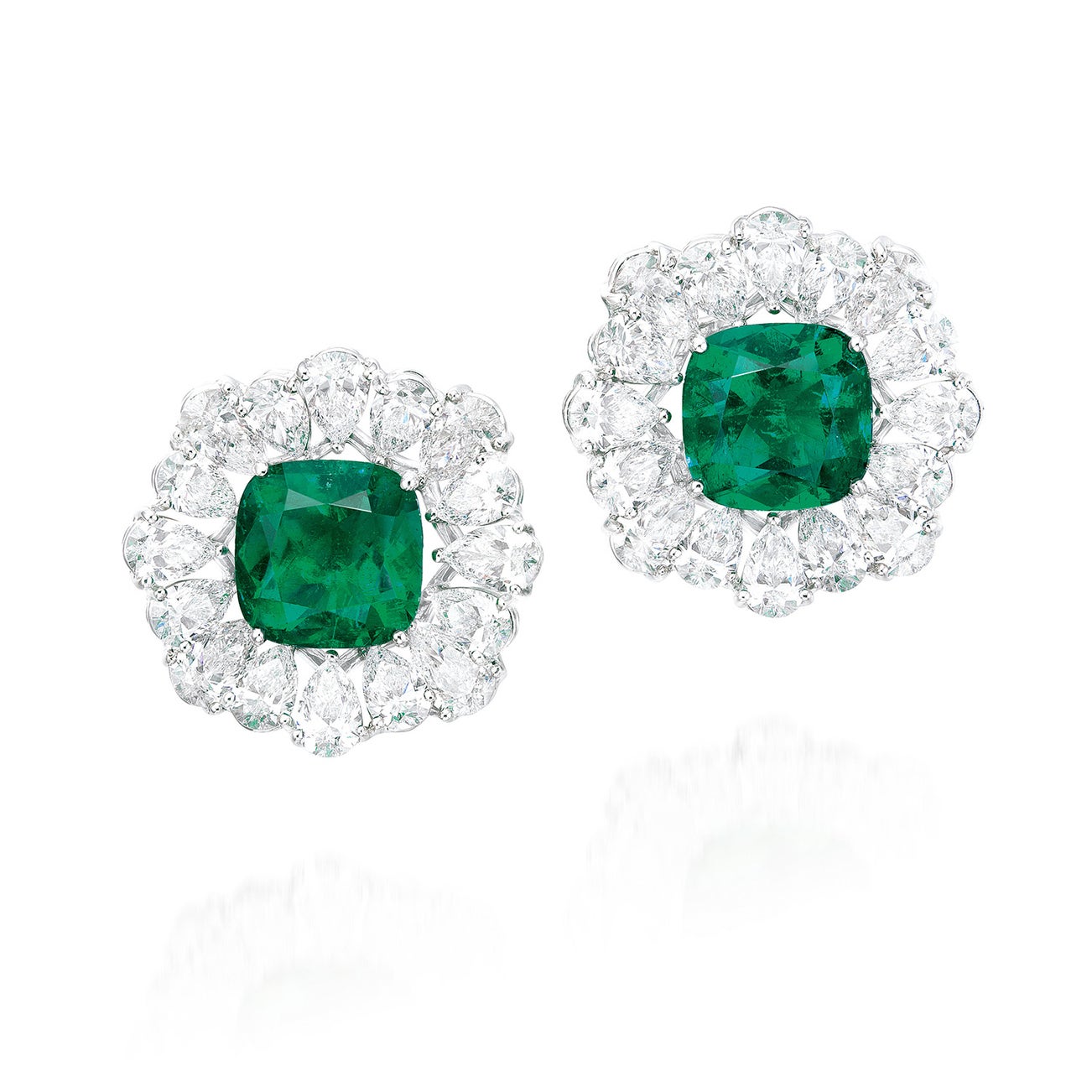 - Two cushion-shaped emeralds, 6.45 and 6.52 carats respectively