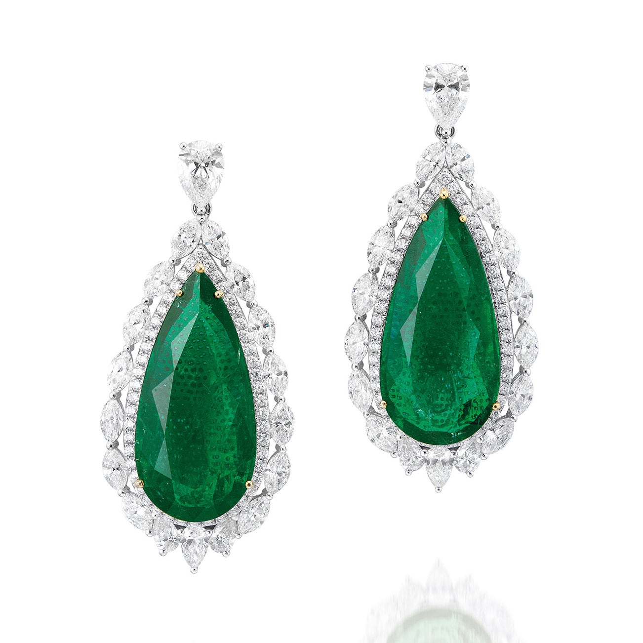 - Two pear-shaped emeralds, 29.98 and 31.77 carats respectively