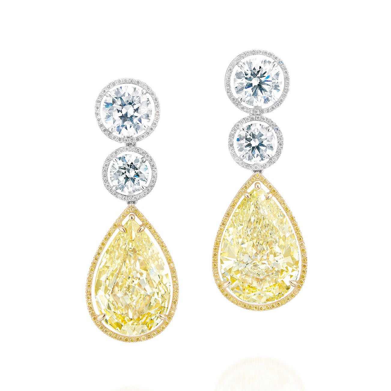 - Two pear-shaped Fancy Yellow diamonds, 10.80 and 13.03 carats respectively