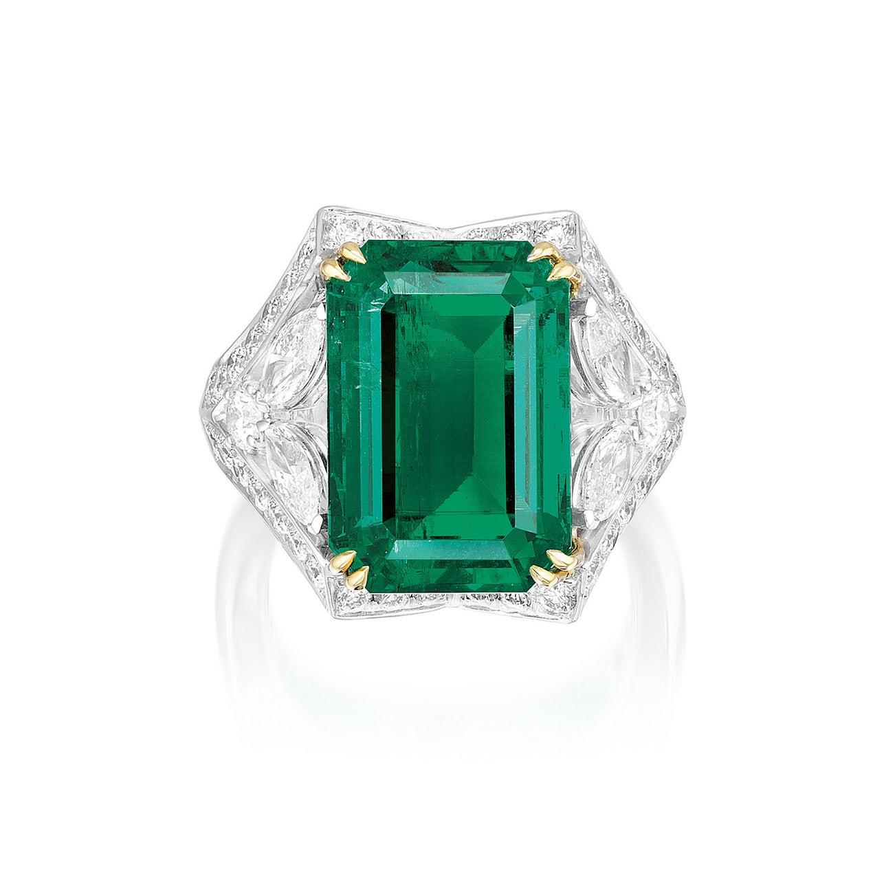 One octagonal step-cut emerald, 11.38 caratsFour marquise-cut and eighty-six brilliant-cut diamonds, 2.83 carats total18K white gold and gold<em>GRS Report: Colombia, with gemological evidence of insignificant clarity enhancement</em>