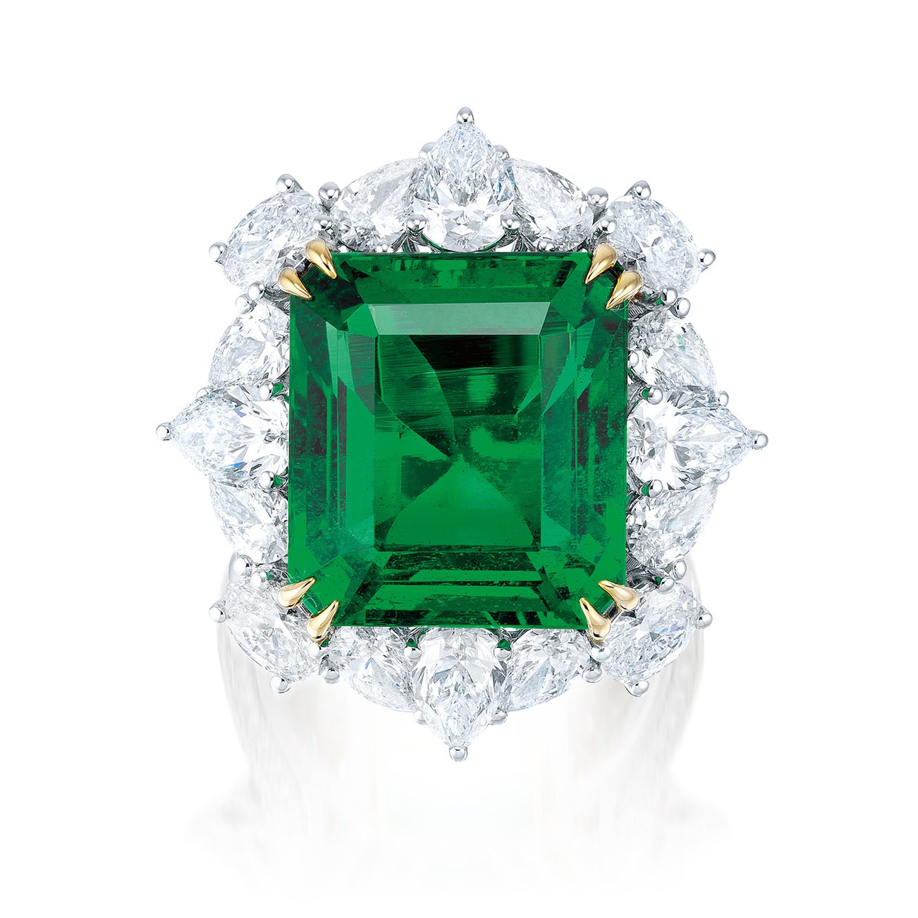 One octagonal step-cut emerald, 16.48 caratsTwelve pear and four oval-shaped diamond surround, 4.75 carats total