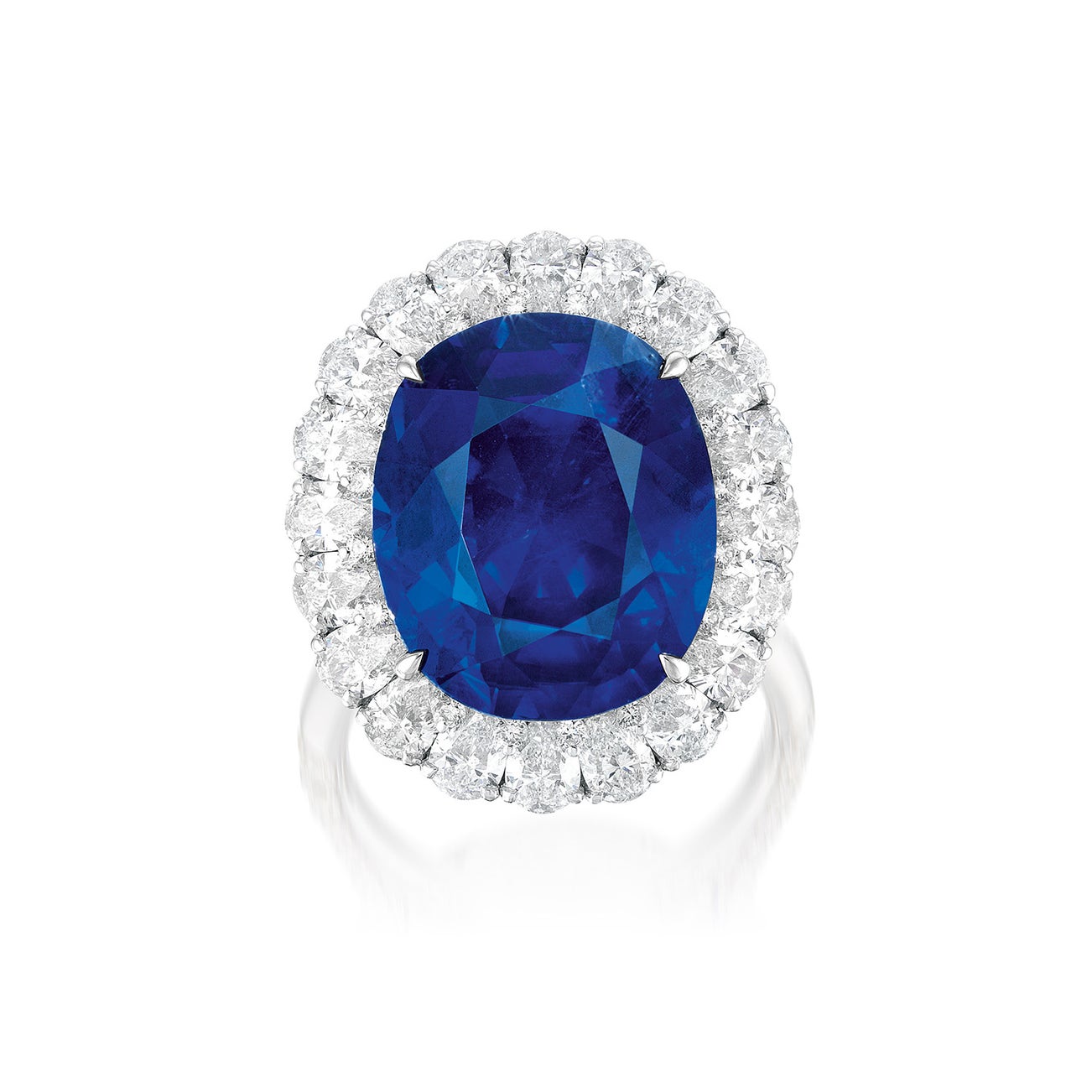 One oval-shaped sapphire, 14.93 caratsPear-shaped and brilliant-cut diamond surround, 3.73 carats18K white gold<em>GRS Report: Burma, no indication of thermal treatment, 'Royal Blue' colour</em>