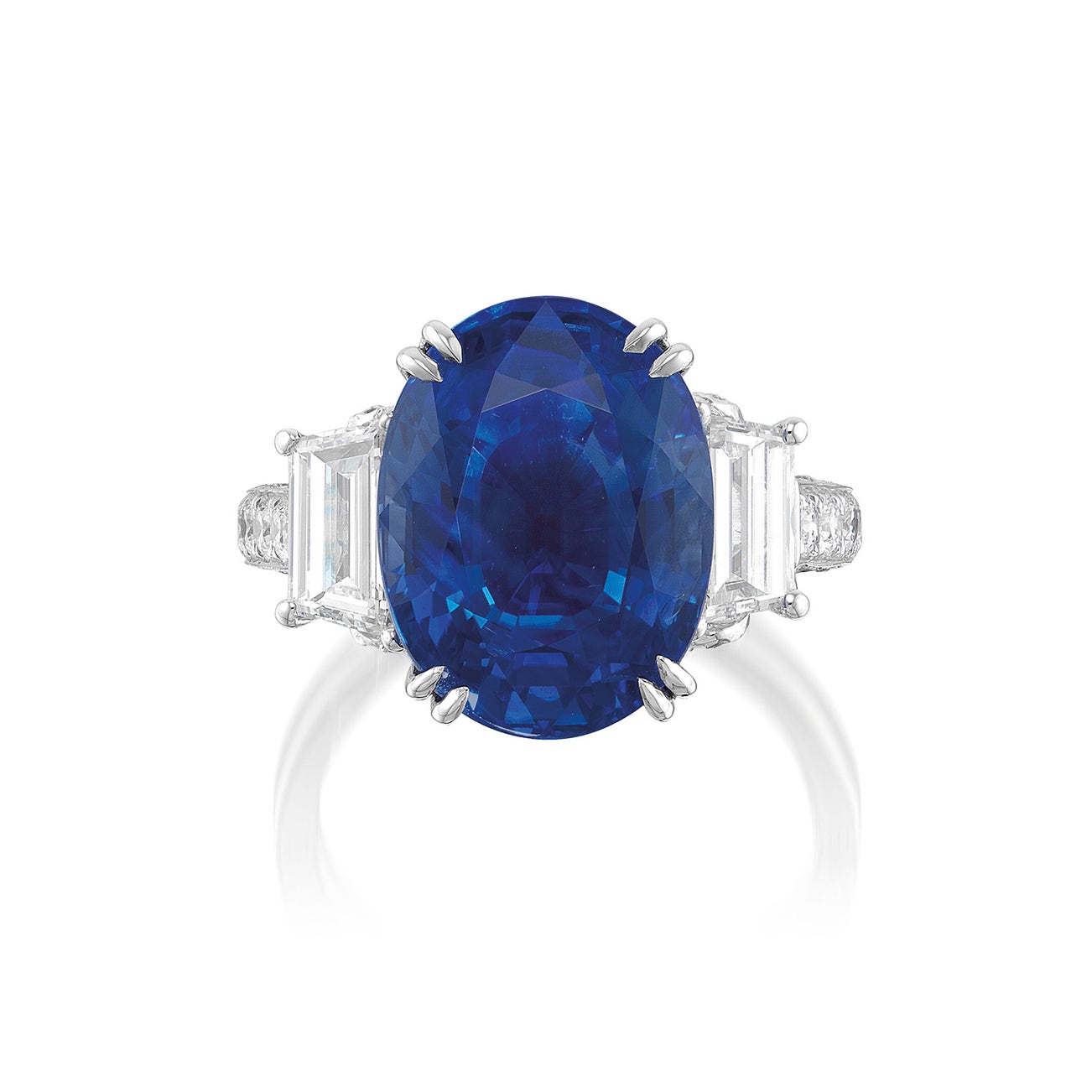 One oval-shaped sapphire, 10.76 caratsTwo trapezoid-cut diamonds on the sides, 1.26 carats total