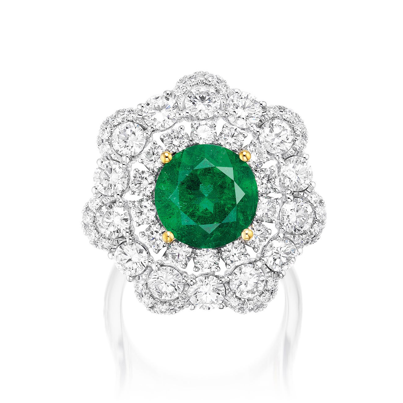 One circular-cut emerald, 3.92 caratsBrilliant-cut diamond surround and on the sides, 3.50 carats total18K white gold and gold<em>GRS Report: Zambia, with gemological evidence of minor clarity enhancement</em>