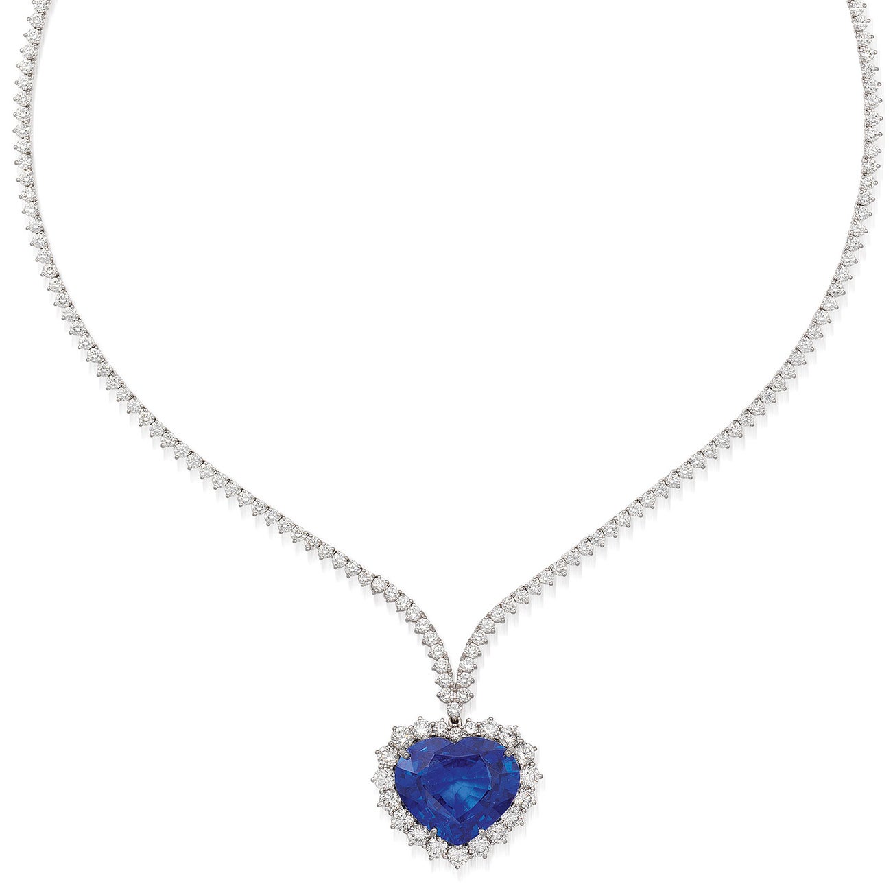 One heart-shaped sapphire, 18.26 caratsBrilliant-cut diamond surround and neck chain, 9.40 carats total18K white gold<em>GRS Report: No Origin, no indication of thermal treatment, ‘Royal Blue’ colour</em>
