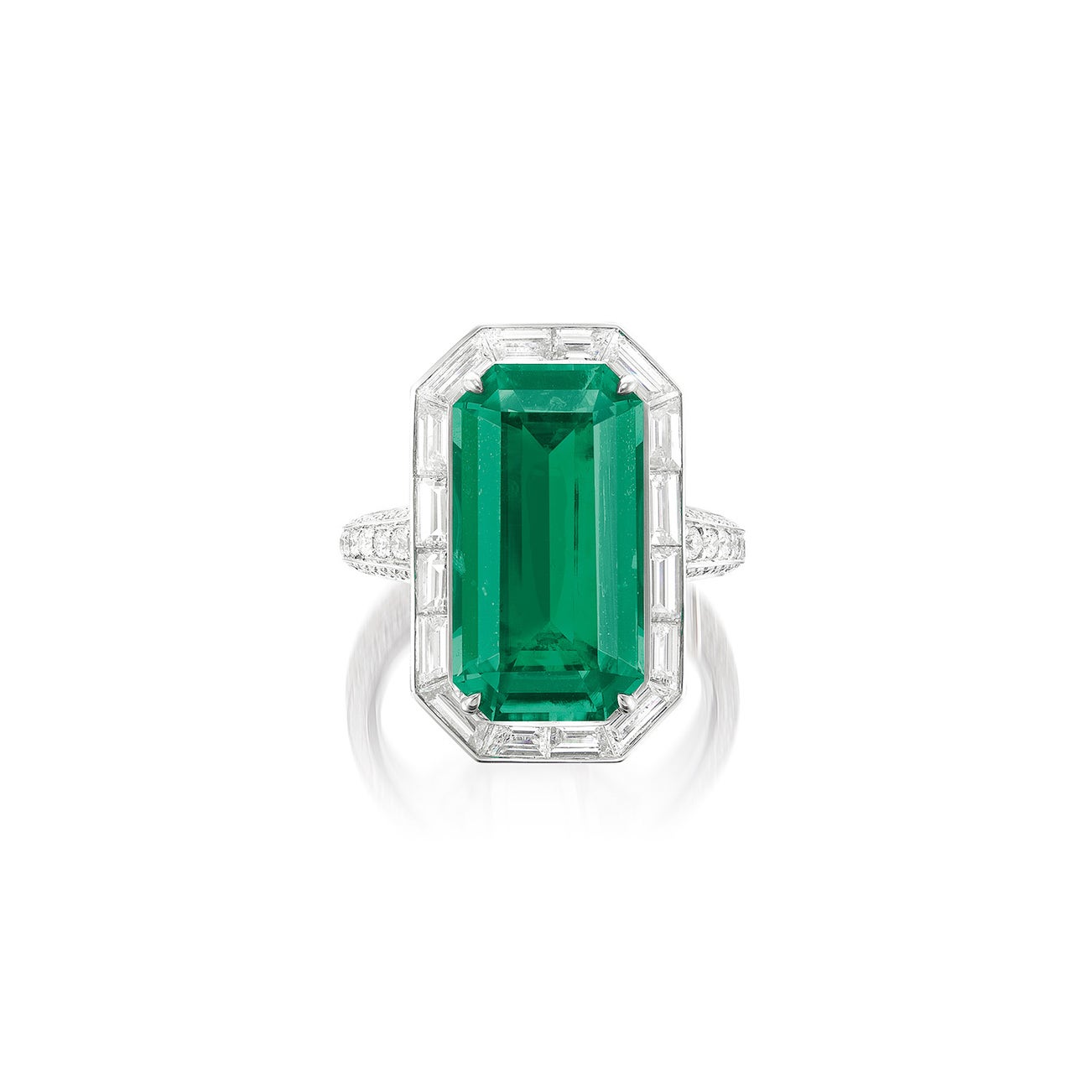 One cut-cornered rectangular-cut emerald, 6.66 caratsTwelve tapered-baguette and four baguette-cut diamonds, 1.35 carats total
