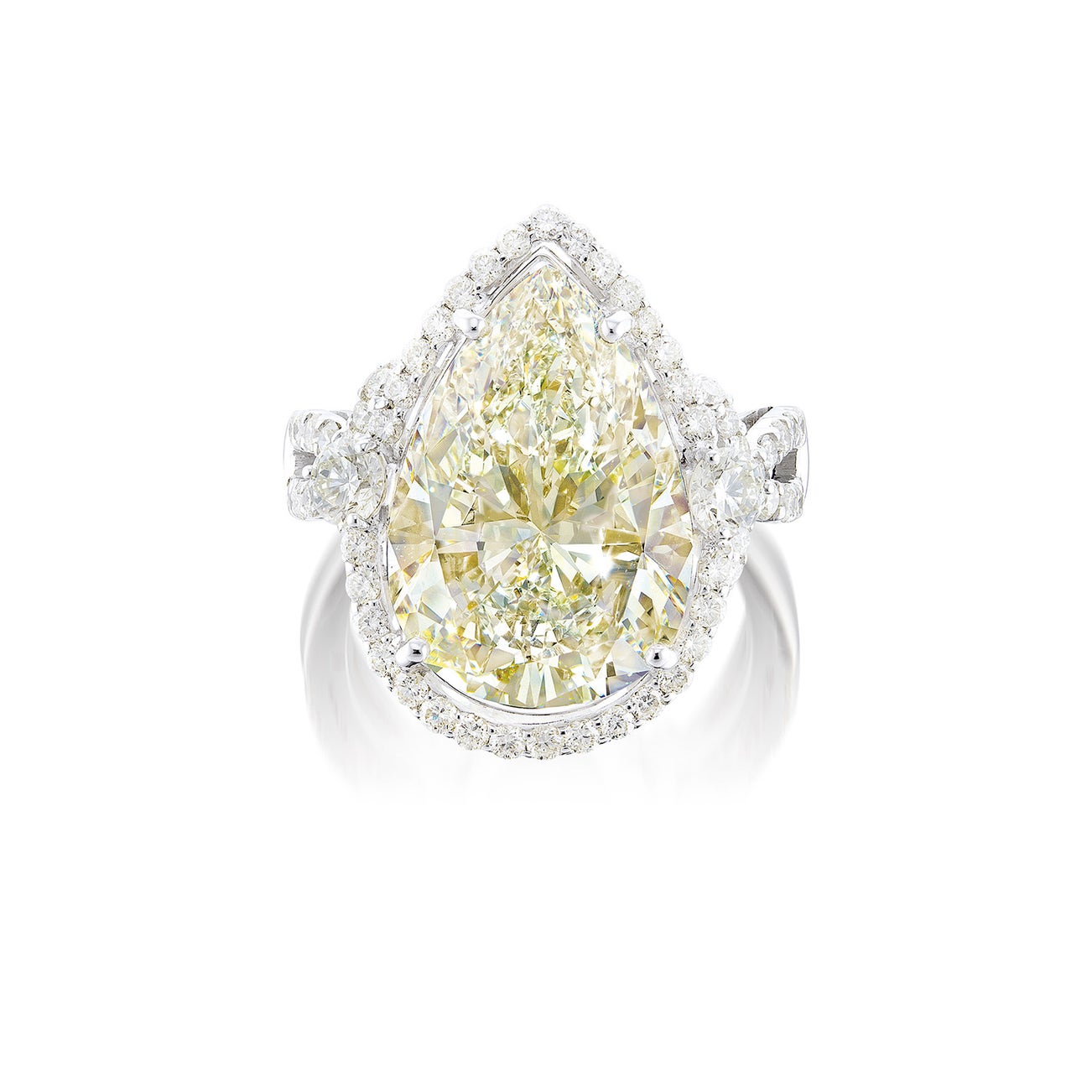 One pear-shaped diamond, 10.12 caratsSixty-nine brilliant-cut diamond surround and on the sides, approximately 1.42 carats totalPlatinum<em>GIA Report: U to V colour, VS1 clarity