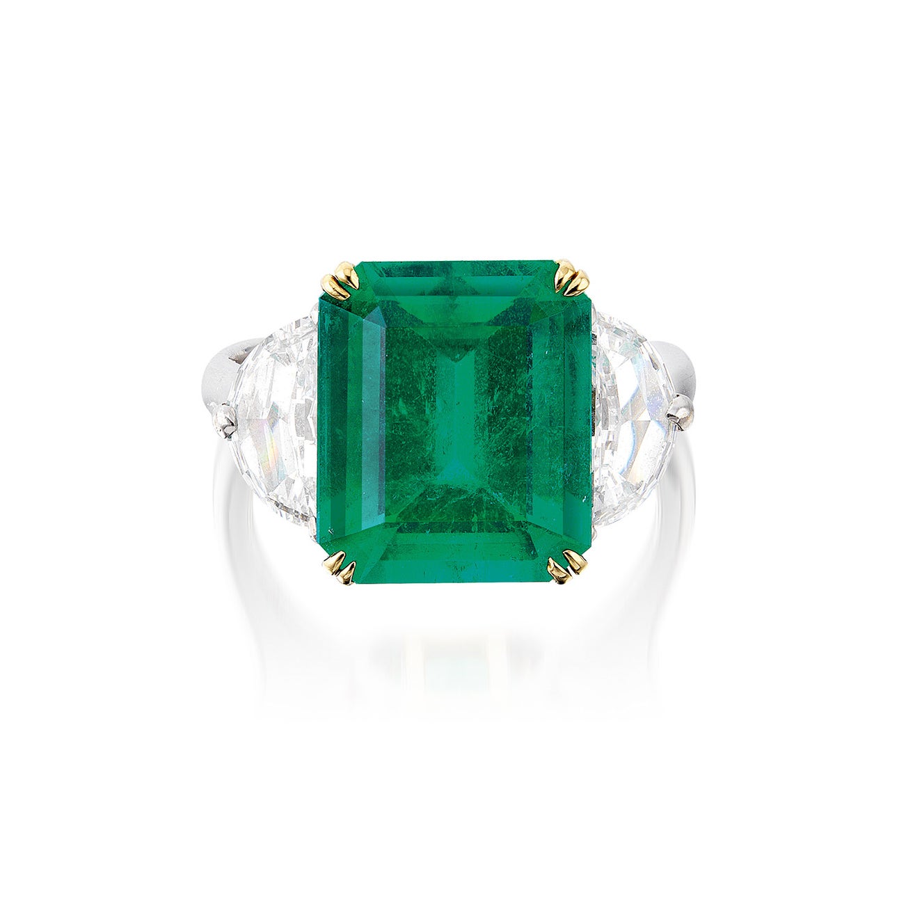 One octagonal step-cut emerald, 5.70 caratsTwo half moon-cut diamonds on the sides, 1.26 carats total18K white gold and gold<em>GRS Report: Colombia, with gemological evidence of minor clarity enhancement, ‘Muzo Green’ colour</em>