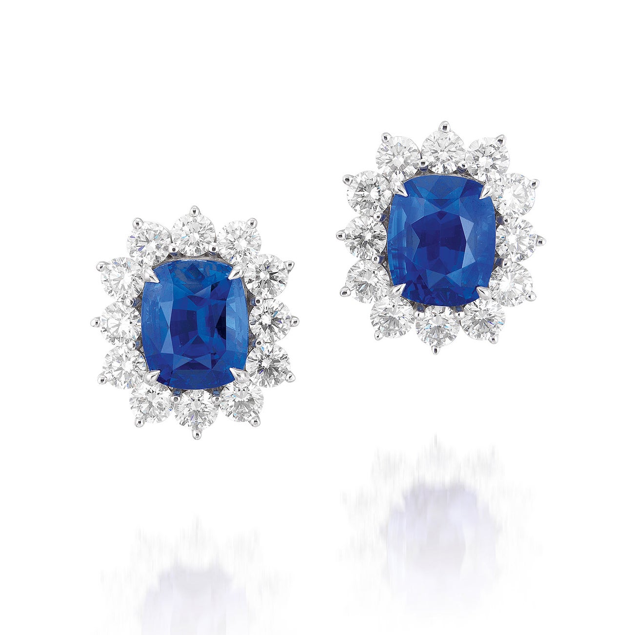 Two cushion-shaped sapphires, 13.23 carats totalTwenty-four brilliant-cut diamond surround, 2.00 carats totalPlatinum and 18K white gold<em>GRS Report: Sri Lanka, with gemological evidence of heating, 'Royal Blue' colour</em>