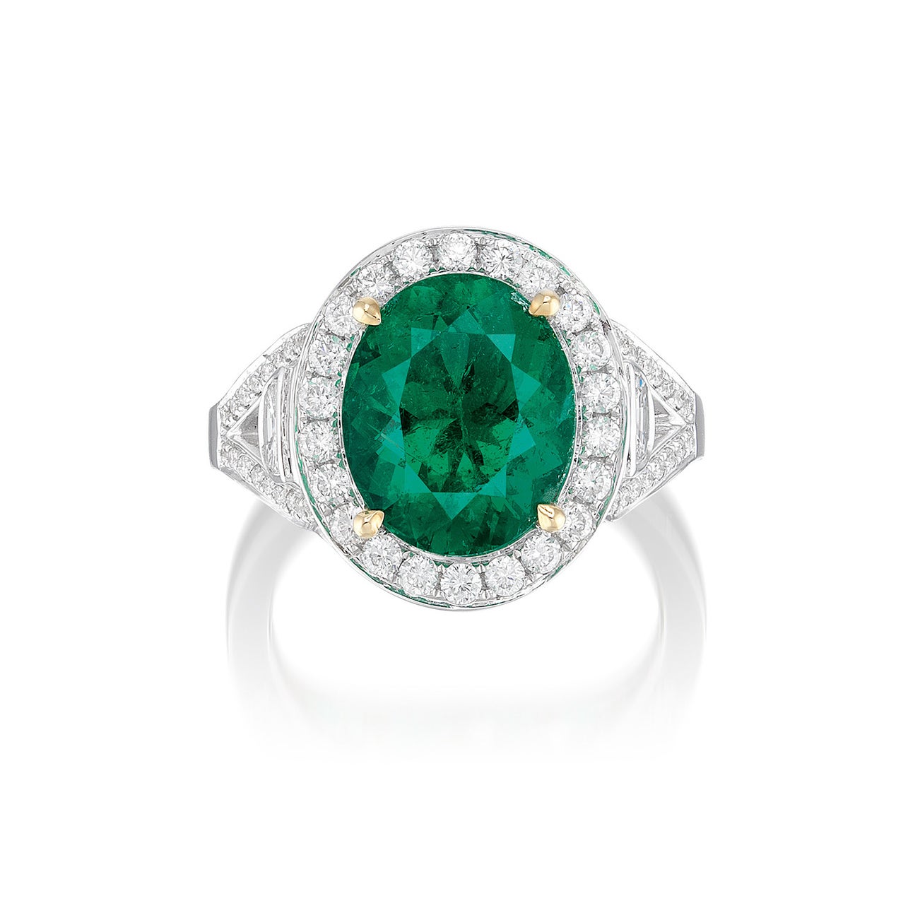 One oval-shaped emerald, 4.26 caratsTwo half moon-cut diamonds on the sides and brilliant-cut diamond surround, 1.31 carats totalPlatinum and 18K gold<em>GRS Report: Colombia, with gemological evidence of insignificant clarity enhancement</em>