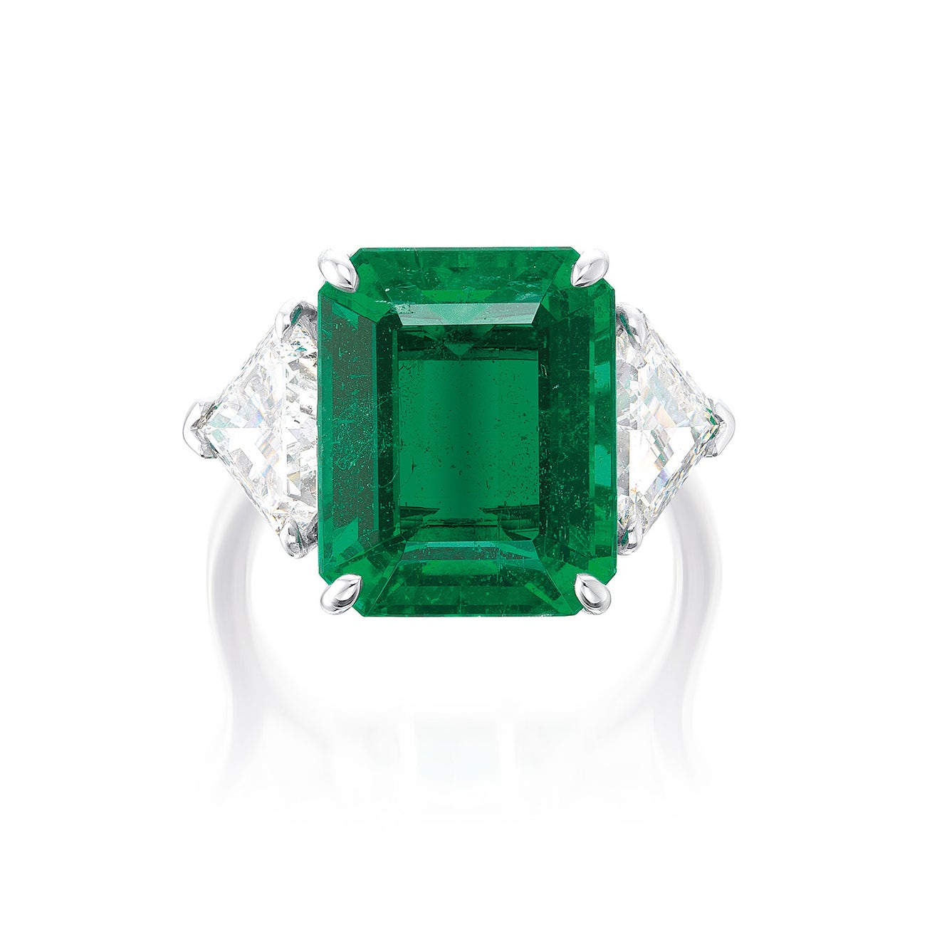 One octagonal step-cut emerald, 8.63 caratsTwo shield-cut diamonds on the sides, 2.10 carats totalPlatinum<em>Gübelin Report: Zambia, no indications of clarity enhancement</em>