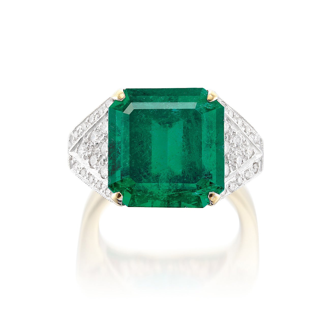 One octagonal step-cut emerald, 10.10 caratsThirty-two brilliant-cut diamonds on the sides, 0.44 carat total18K gold<em>GRS Report: Colombia, with gemological evidence of insignificant clarity enhancement, ‘Muzo Green’ colour</em>