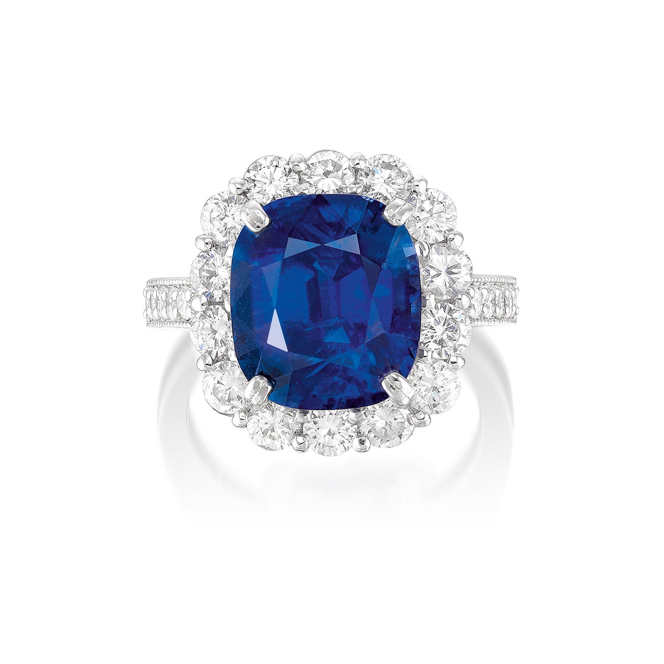 One cushion-shaped sapphire, 6.39 caratsTwenty-four brilliant-cut diamond surround and on the sides, 1.66 carats totalPlatinum and 18K white gold<em>GRS Report: Burma, no indication of thermal treatment, ‘Royal Blue’ colour</em>