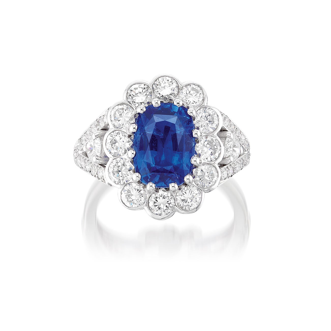 One cushion-shaped sapphire, 3.00 caratsFourteen brilliant-cut diamond surround and on the sidesPlatinumBritish hallmarks<em>GRS Report: Sri Lanka, with no gemological evidence of heating</em>