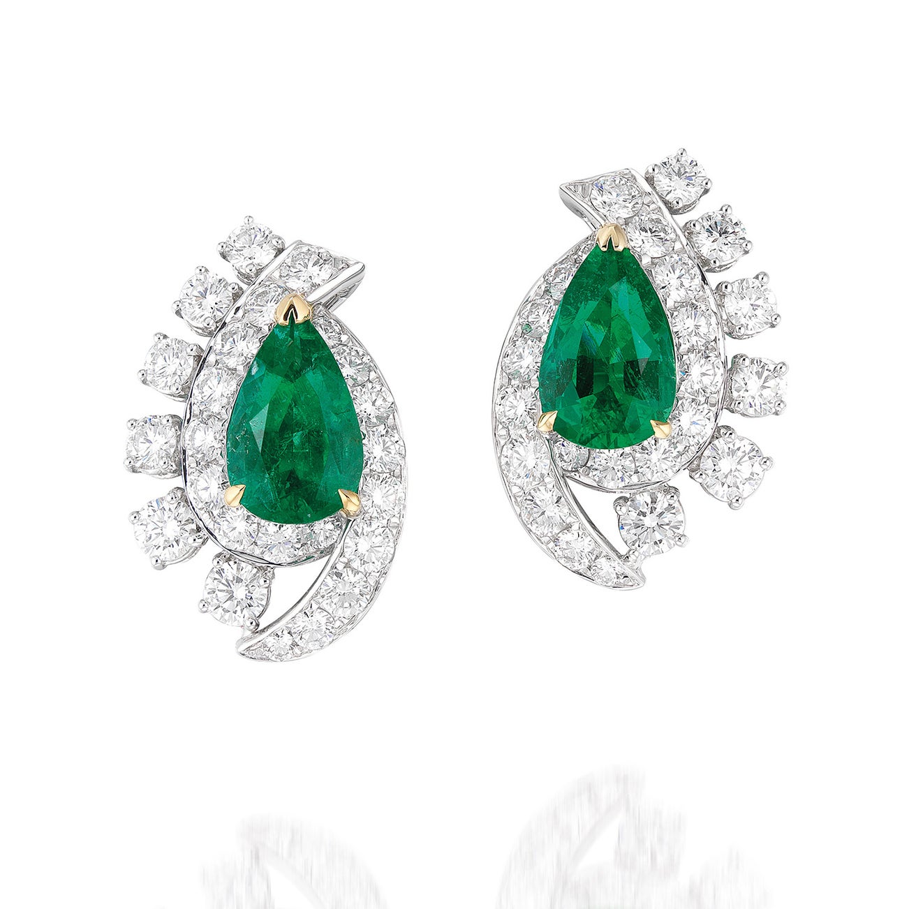Two pear-shaped emeralds, 4.04 carats totalForty-eight brilliant-cut diamonds, 3.39 carats total18K white gold and gold<em>GRS Report: Zambia, with gemological evidence of insignificant to minor clarity enhancement</em>