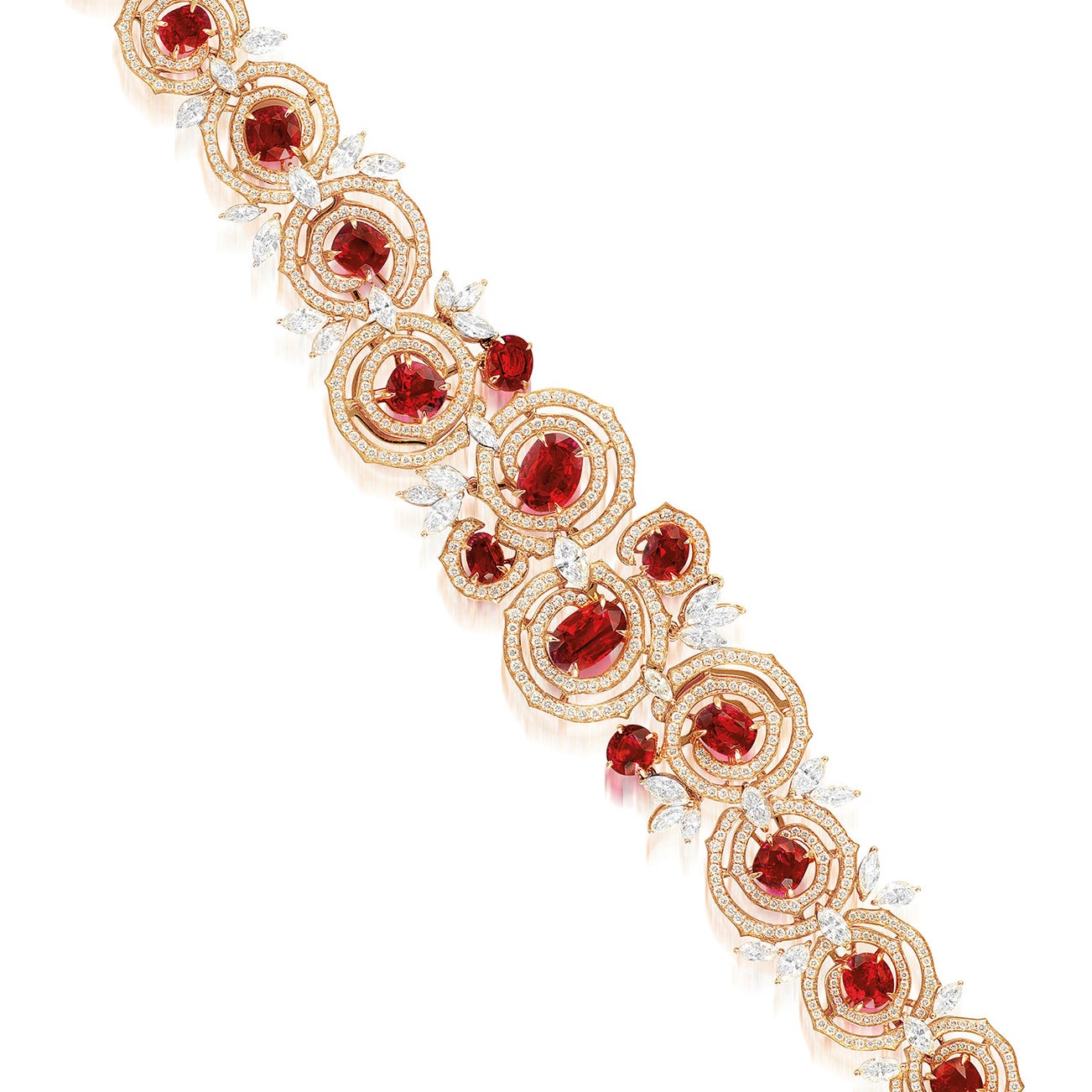 Six hundred and thirty brilliant-cut diamonds, 3.19 carats total18K pink gold<em>Gübelin Report: All Burma, no indications of heating, a few of the rubies are called 'Pigeon's Blood' red colour
