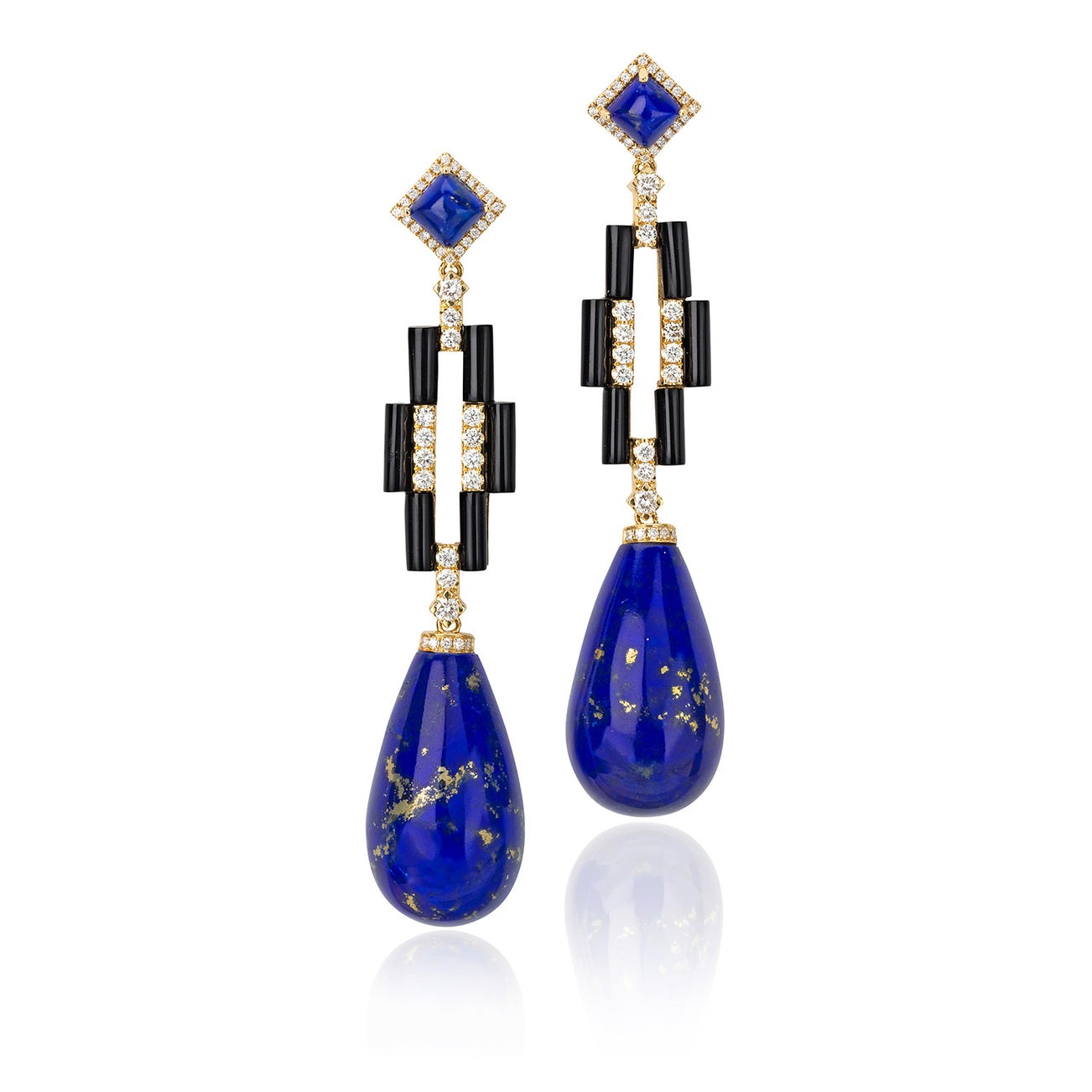 A Pair of Lapis Lazuli, Onyx, and Diamond Earrings