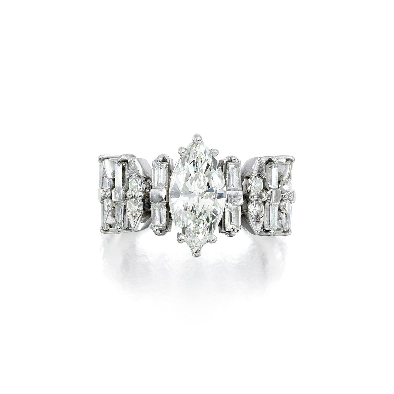 Rectangular step-cut baguettes, round brilliant-cut, and single-cut diamonds, total approximately 1.10 cts.
