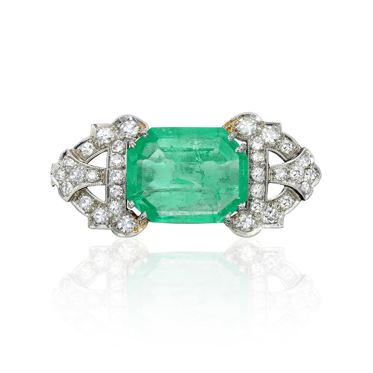 An Art Deco Emerald Diamond, Platinum, and White Gold Brooch