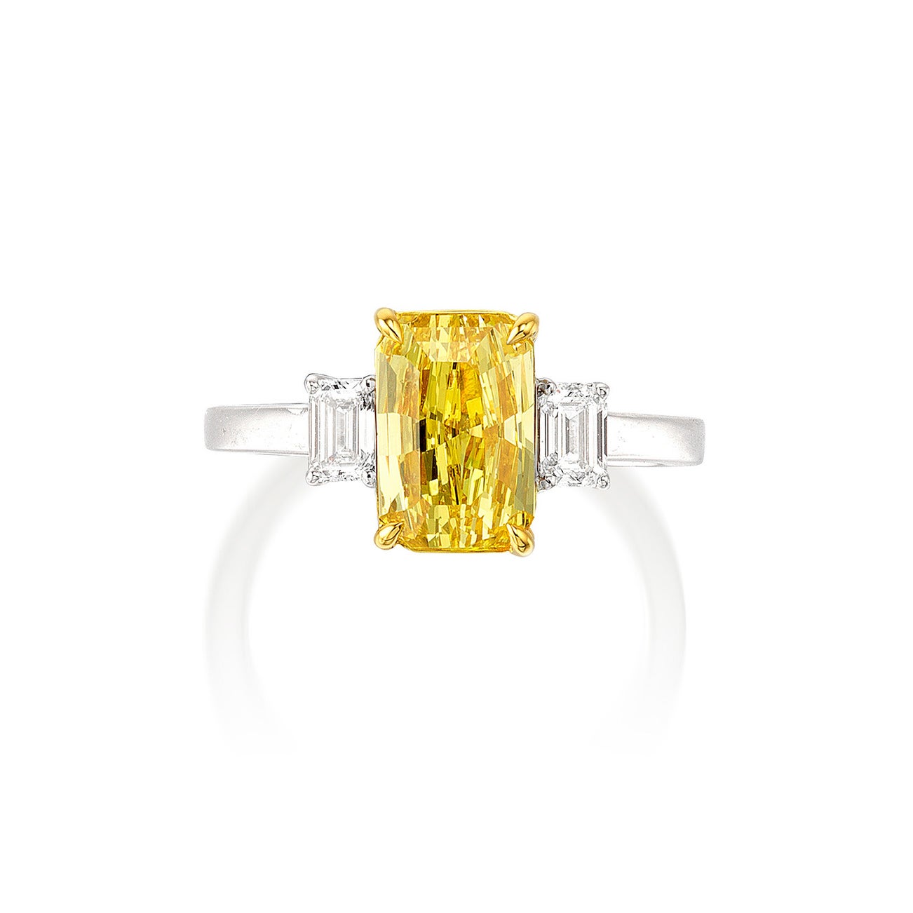 - One cut-cornered rectangular-cut Fancy Vivid Yellow diamond, 2.01 carats