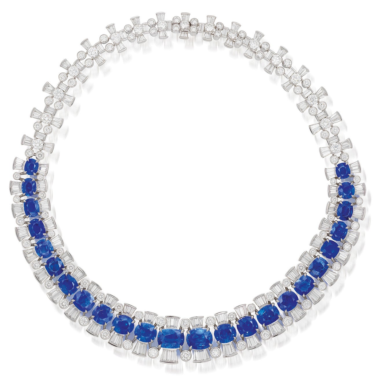 Fifteen cushion and nine oval-shaped sapphires, 78.19 carats totalTapered baguette and brilliant-cut diamonds, 34.92 carats totalPlatinumSigned Serlas Unique<em>Twenty-three Gübelin Reports: (twenty three sapphires were tested)