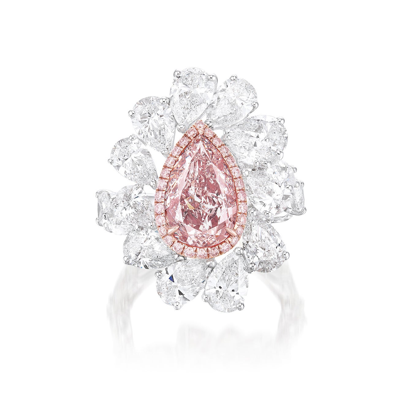 - One pear-shaped Fancy Orangy Pink diamond, 3.01 carats