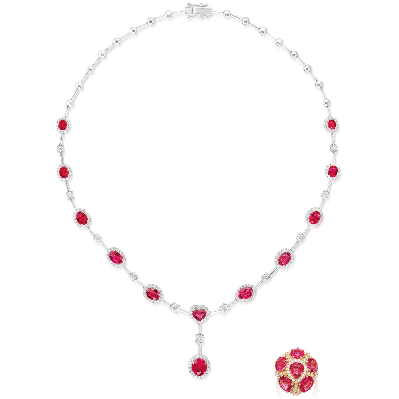 A Set of Coloured Spinel and Diamond Necklace and Ring