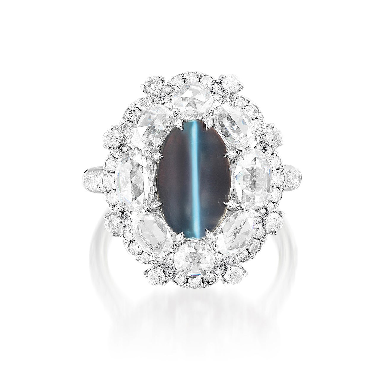 One oval-shaped cabochon cat's eye alexandrite chrysoberyl, 6.27 caratsEight rose-cut diamond surround, 1.47 carats total