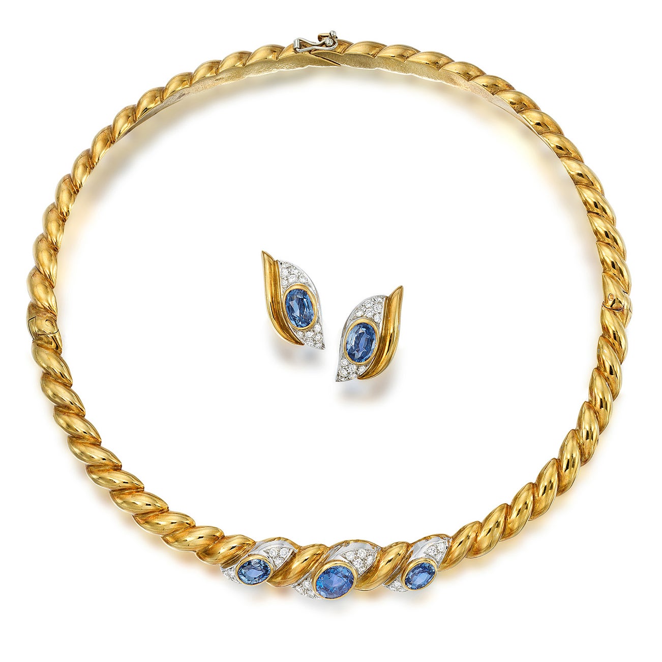 Platinum and 18K yellow gold, necklace inner circumference approximately 14 7/8 inches, earclips length approximately 1 inch