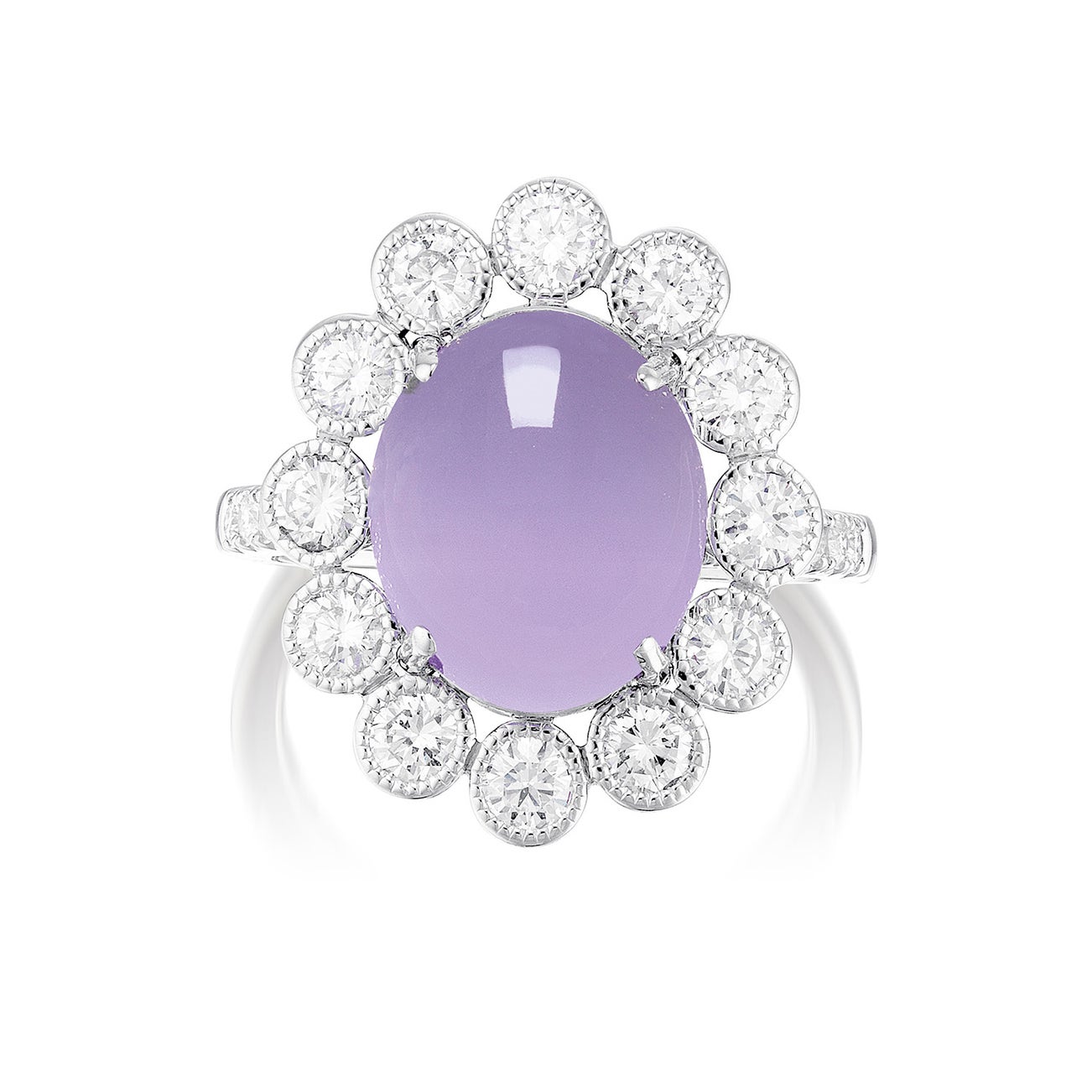 One oval lavender jadeite cabochonTwenty-four brilliant-cut diamond and and twelve pear-shaped diamond surroundPlatinum<em>Please refer to department for details of Hong Kong Jade & Stone Laboratory Report </em>