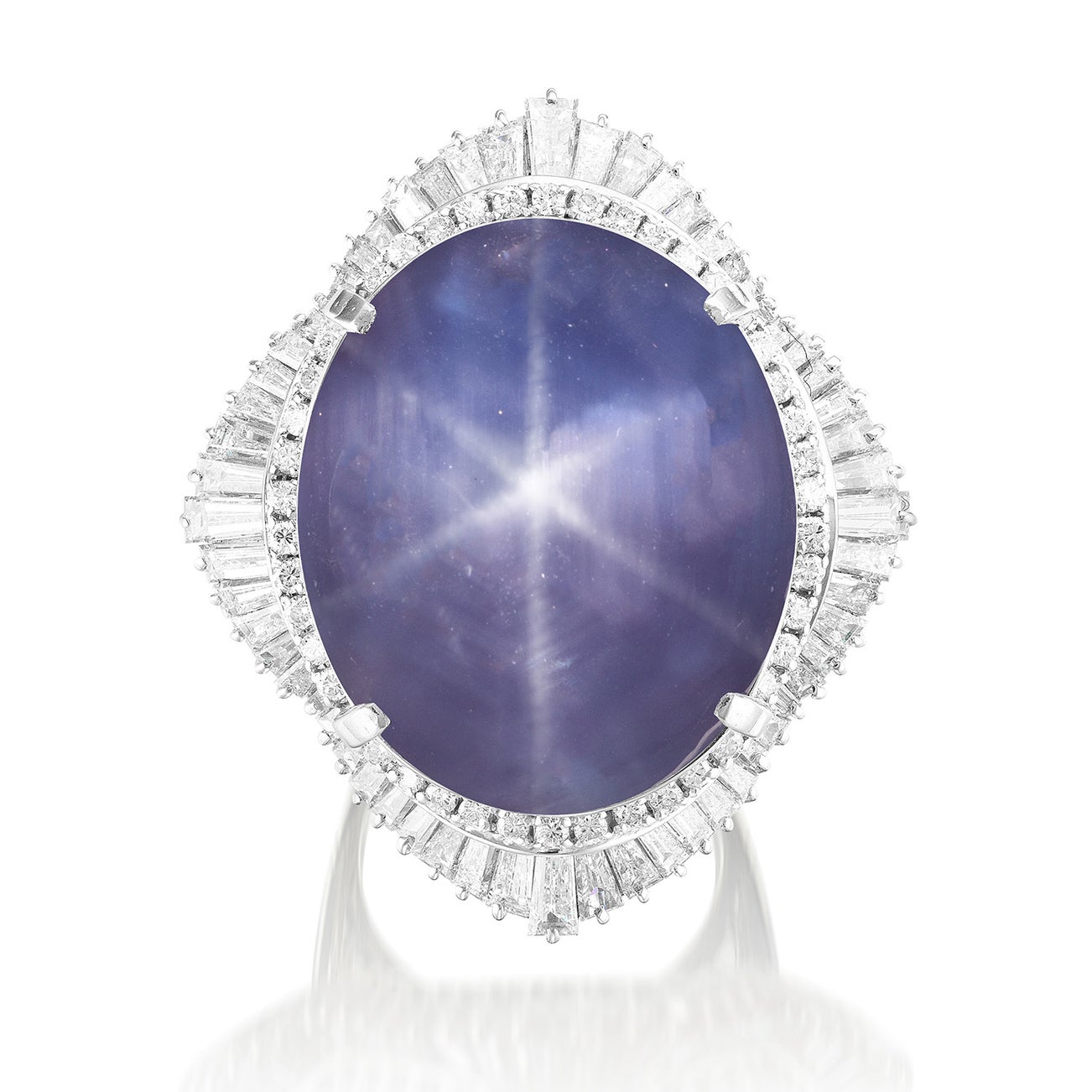 One oval-shaped cabochon star sapphire, 134.15 caratsBrilliant-cut and tapered baguette-cut diamond surroundPlatinum<em>GRS Report: Sri Lanka, no indication of thermal treatment</em>