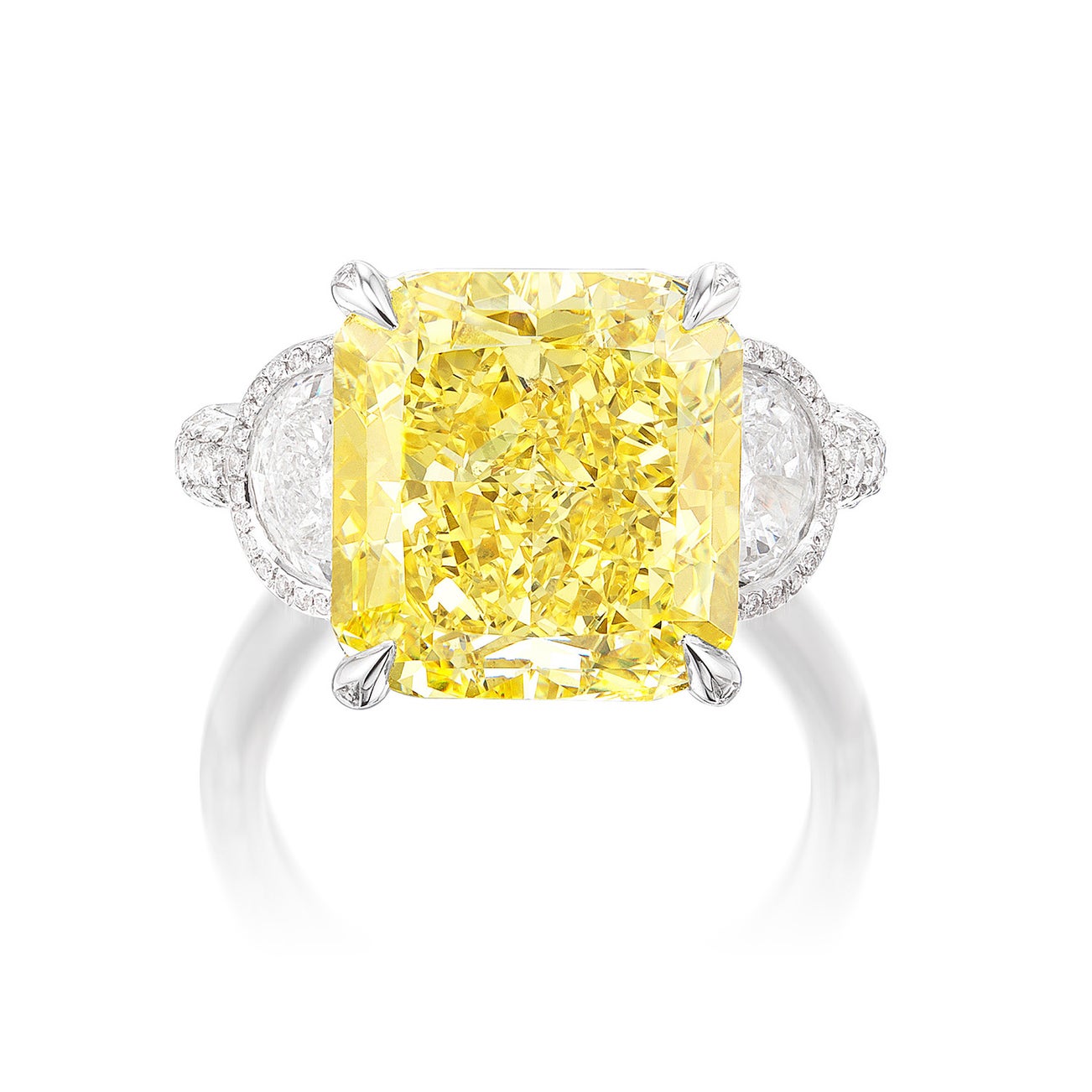 One round-cornered square-cut Fancy Vivid Yellow diamond, 9.25 caratsTwo half-moon cut diamonds and brilliant-cut diamonds on the sides, 1.85 carats total18K white gold<em>GIA Report: Fancy Vivid Yellow colour, Internally Flawless clarity</em>