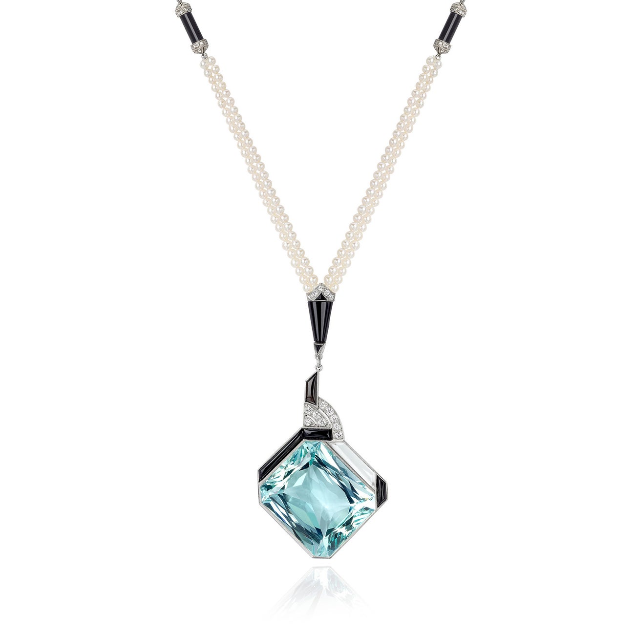 An Art Moderne Aquamarine, Diamond, Onyx, Rock Crystal, Cultured Pearl, and Platinum Necklace