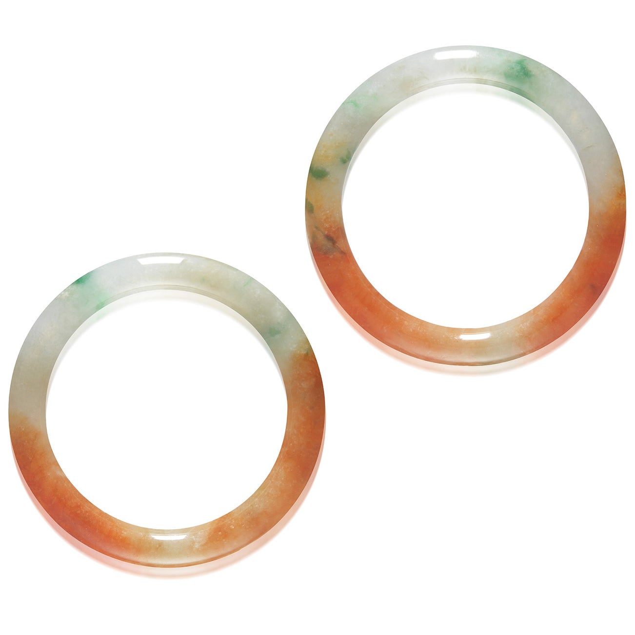 - Two cylindrical bi-colour jadeite bangles