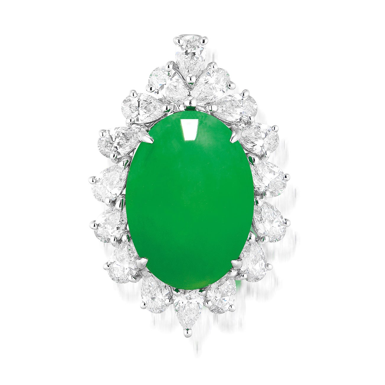One oval-shaped jadeite cabochon, measuring approximately 12.86 x 17.85 x 6.45 mmSixteen pear-shaped diamond surround18K white gold<em>Please refer to department for details of Hong Kong Jade & Stone Laboratory Report</em>