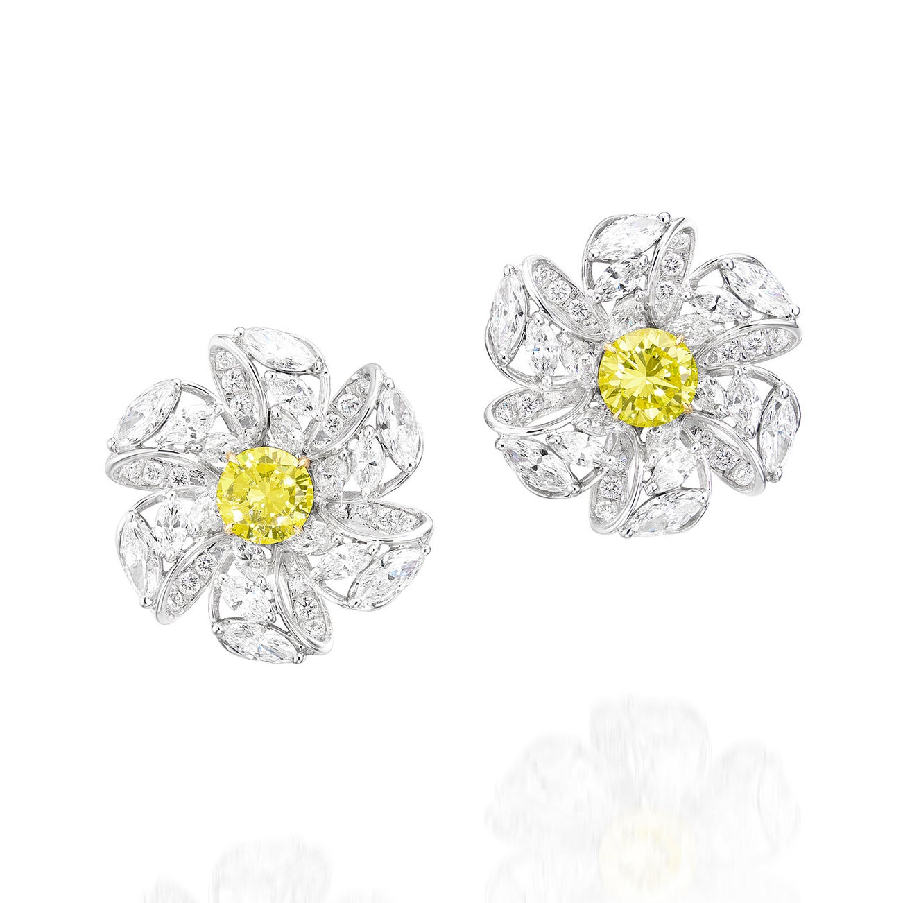 Two brilliant-cut Fancy Intense Yellow diamonds, 1.20 and 1.36 carats respectivelyThirty-six marquise-cut diamonds, 4.66 carats total