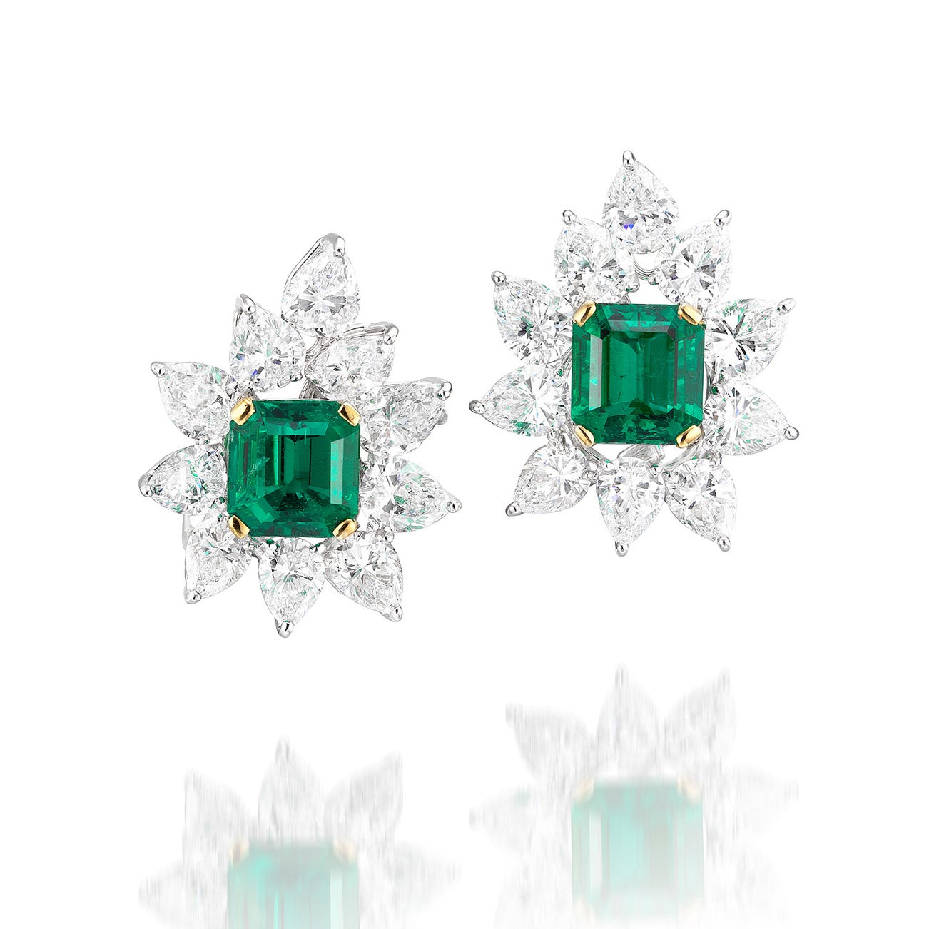 One octagonal step-cut emerald, 3.06 and 3.25 carats respectivelyTwenty pear-shaped diamond surround, approximately 7.40 carats totalPlatinum and 18K gold<em>Two SSEF Reports: Both Colombia, no indications of clarity enhancement</em>