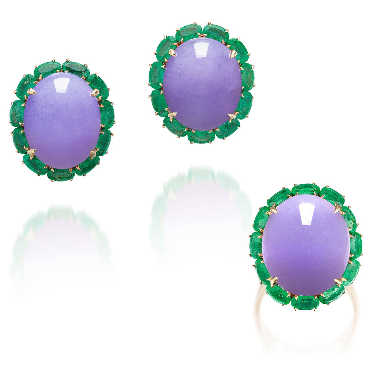 A Set of Lavender Jadeite and Emerald Ring and Earrings