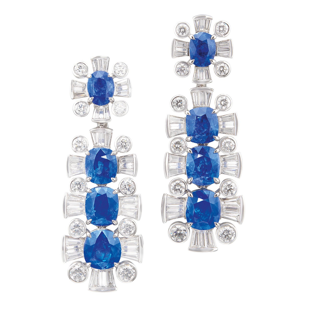 Seven cushion and one oval-shaped sapphires, 23.43 carats totalTapered baguette and brilliant-cut diamonds, 7.26 carats totalPlatinumSigned Serlas Unique<em>Eight Gübelin Reports: (eight sapphires were tested)