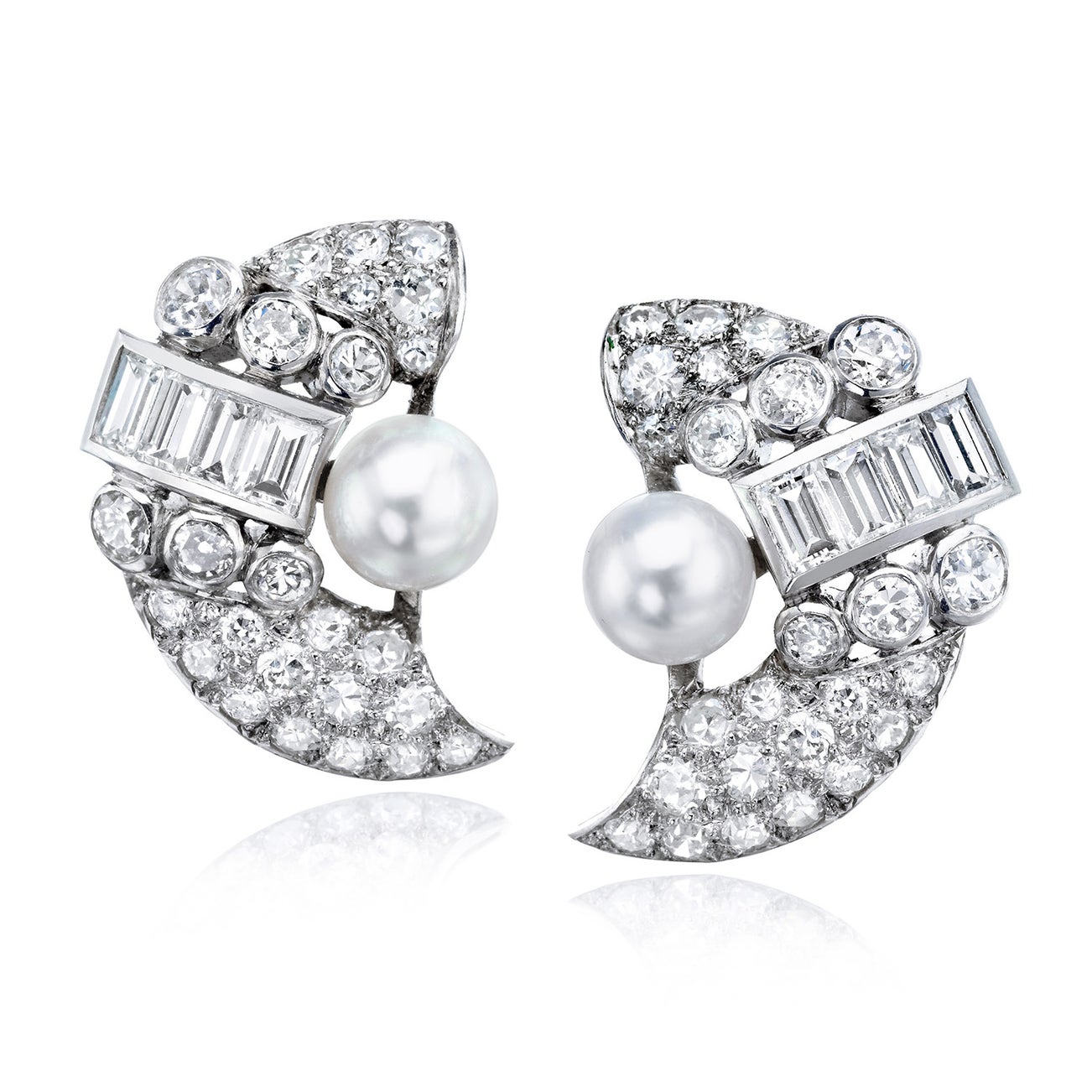 A Pair of Diamond, Pearl, Platinum and Gold Earrings
