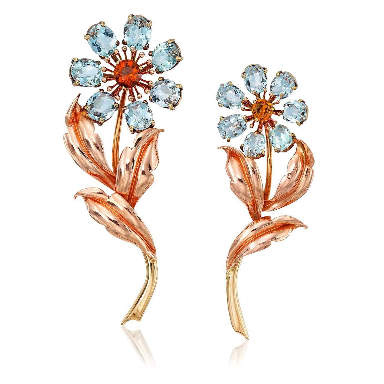 A Pair of Retro Aquamarine, Citrine, and Bi-Colored Gold Brooches