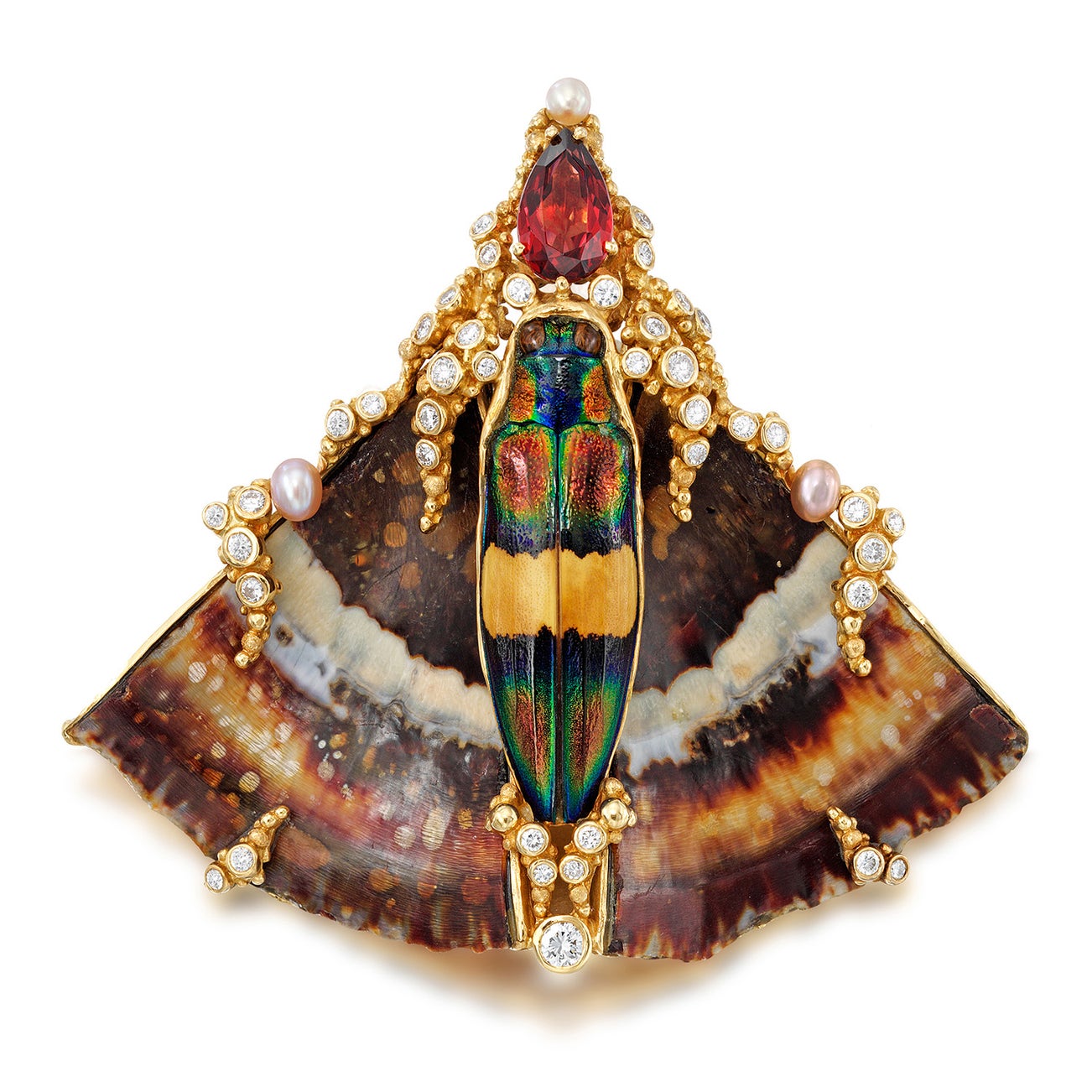 A Beetle, Shell, Tourmaline, Diamond, Pearl, and Gold Pendant