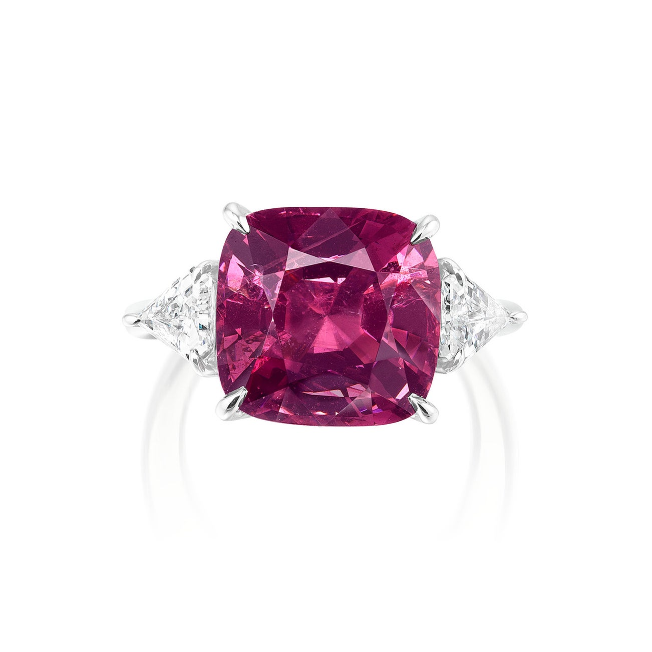 One cushion-shaped Pink-Purple spinel, 9.83 caratsTwo shield-cut diamonds on the sides, 0.90 carat total18K white gold<em>GRS Report: Burma, no indication of thermal treatment</em>