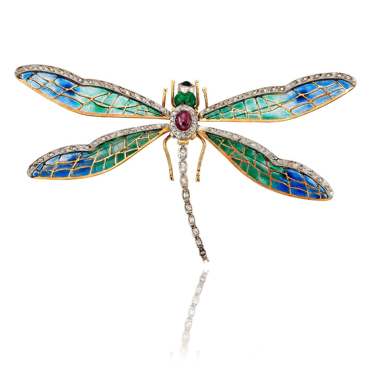 A Ruby, Sapphire, Diamond, Plique-à-Jour, Enamel, and Gold Brooch