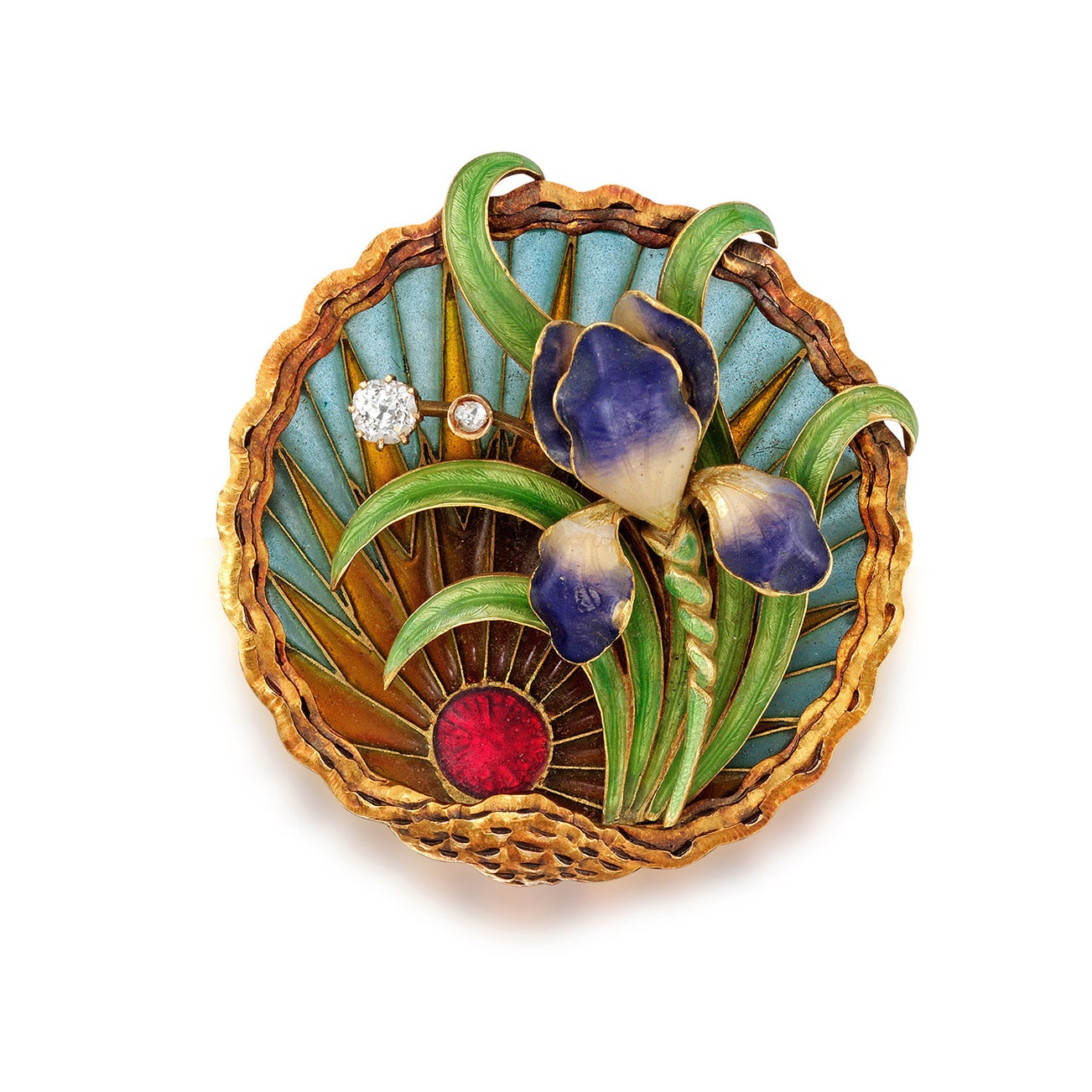 An Art Nouveau Diamond, Enamel, Plique-à-Jour and Gold Brooch