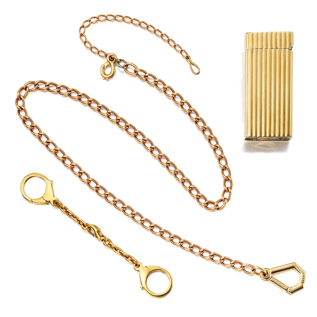 18K and 14K yellow and rose gold, length of sweater clip approximately 3 7/8 inches, length of fob chain approximately 17 inches, length of lighter approximately 2 inches