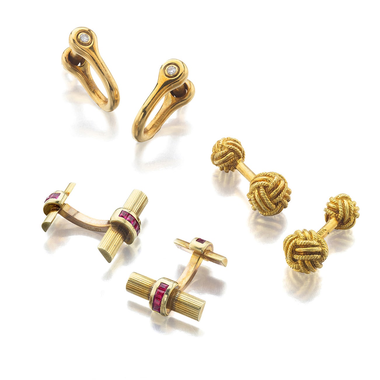 Comprising a gold monkey fist pair, ruby set pair, and a diamond set pair.