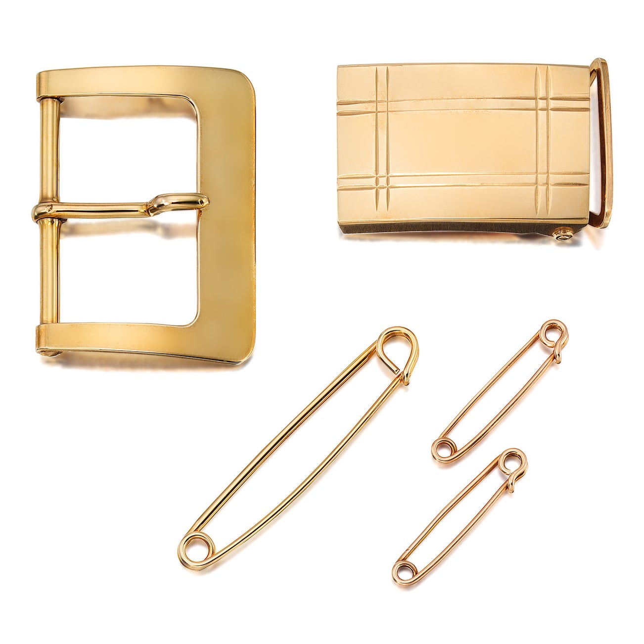A Group of Gold Belt Buckles and Safety Pins