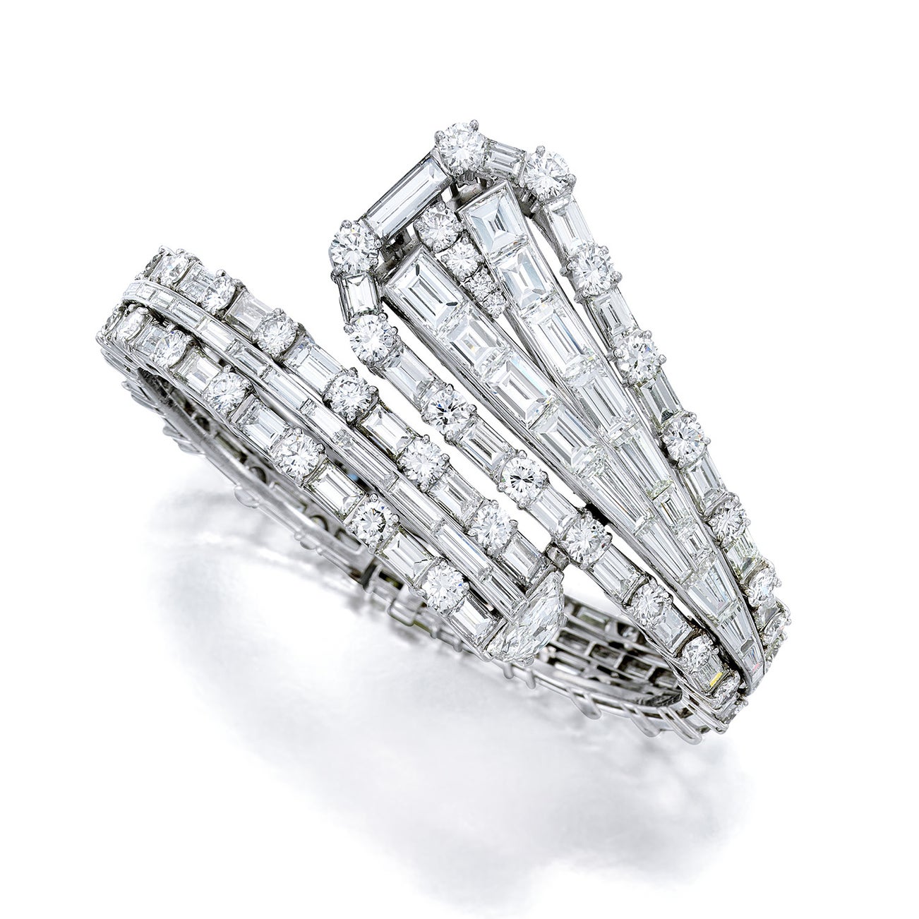 Round brilliant-cut, tapered baguette-cut, rectangular step-cut, half-moon-cut diamonds, total approximately 36.95 cts.